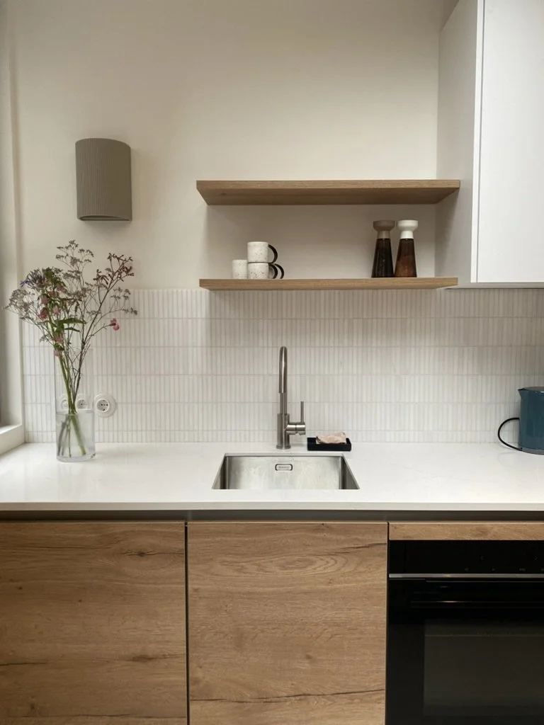 This 88 sqm modern apartment building in Amsterdam Oost, built in 2009, had great bones, high ceilings and a beautiful outlook overlooking a tree lined square. Whilst the building itself was quite modern, the client was drawn to more traditional fixtures and finishes, so my task was to marry the contemporary with the classic. By demolishing a wall between the kitchen and living room, we opened the whole space up, changed the orientation of the kitchen to make it feel larger, create better use of the space and capture the view, whilst allowing light to flood through the entire living & dining room. We also converted the large master bedroom into a master plus walk-in-wardrobe with office nook, and ensured it could be easily converted to a third bedroom in the future with lighting placement and freestanding modular furniture. We also modified the bathroom to include a bathtub, custom built storage, drop ceiling with LED lighting and handmade classical tiles, making the whole feel both contemporary and classic.